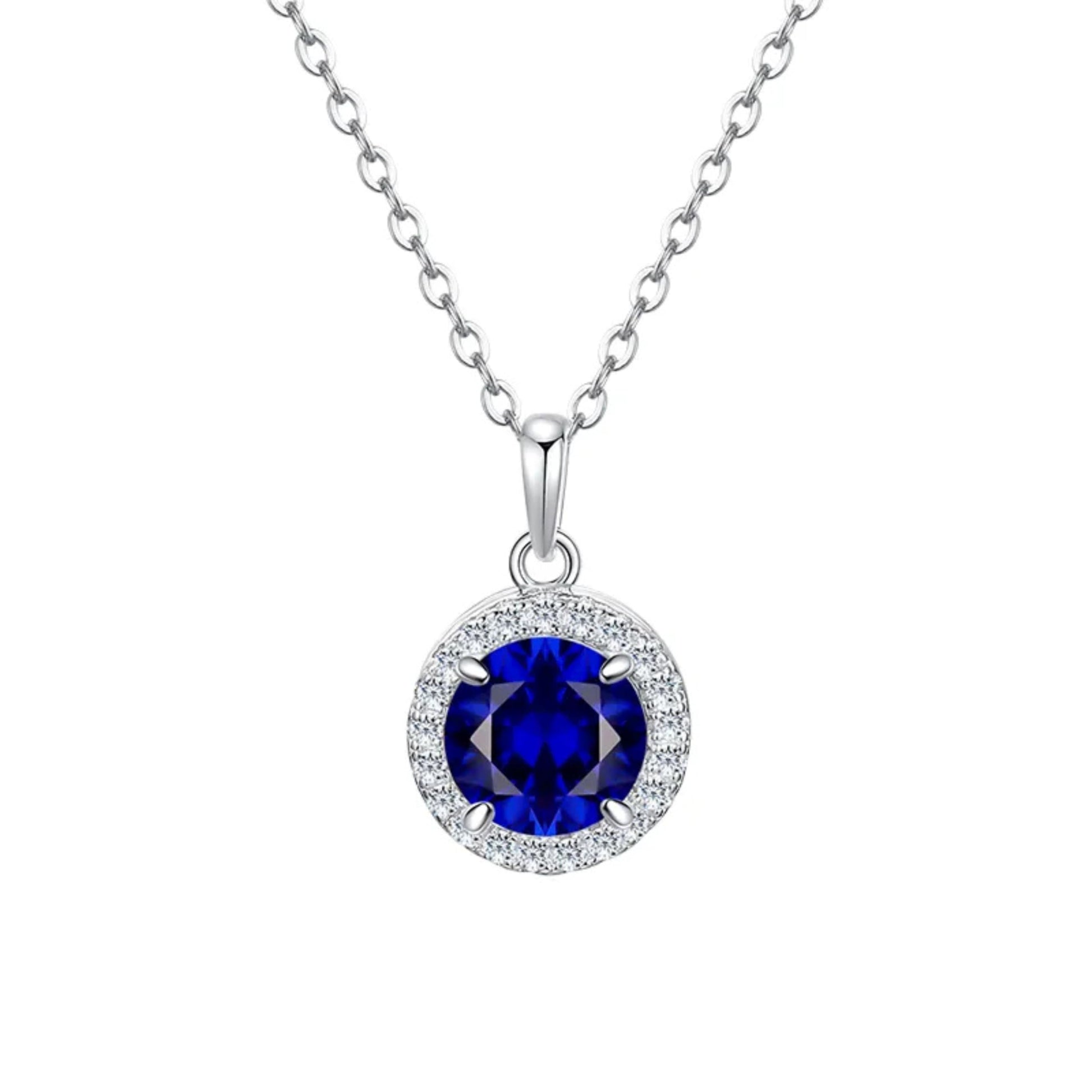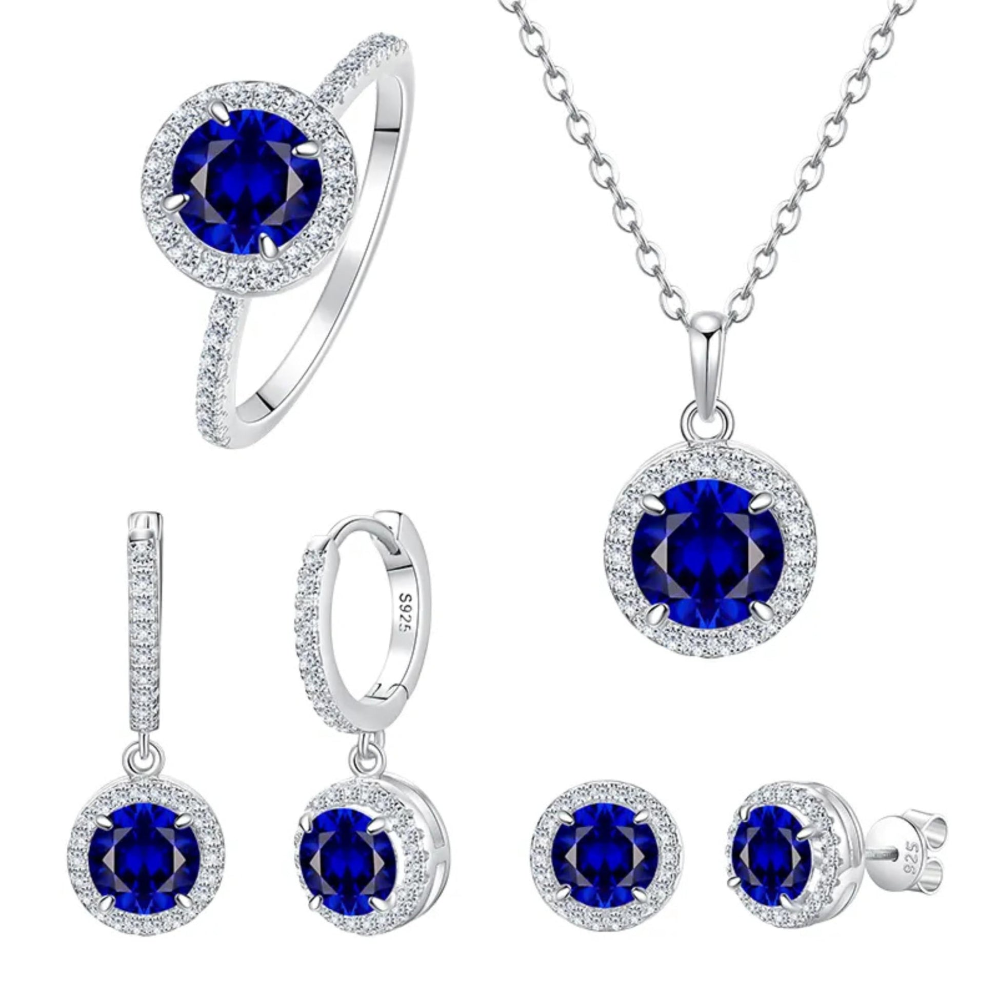 925 Sterling Silver Round Birthstone Blue Stone Zircon Diamond Jewelry Set for Women, Halo Necklace, Earrings & Ring, 4 Pieces