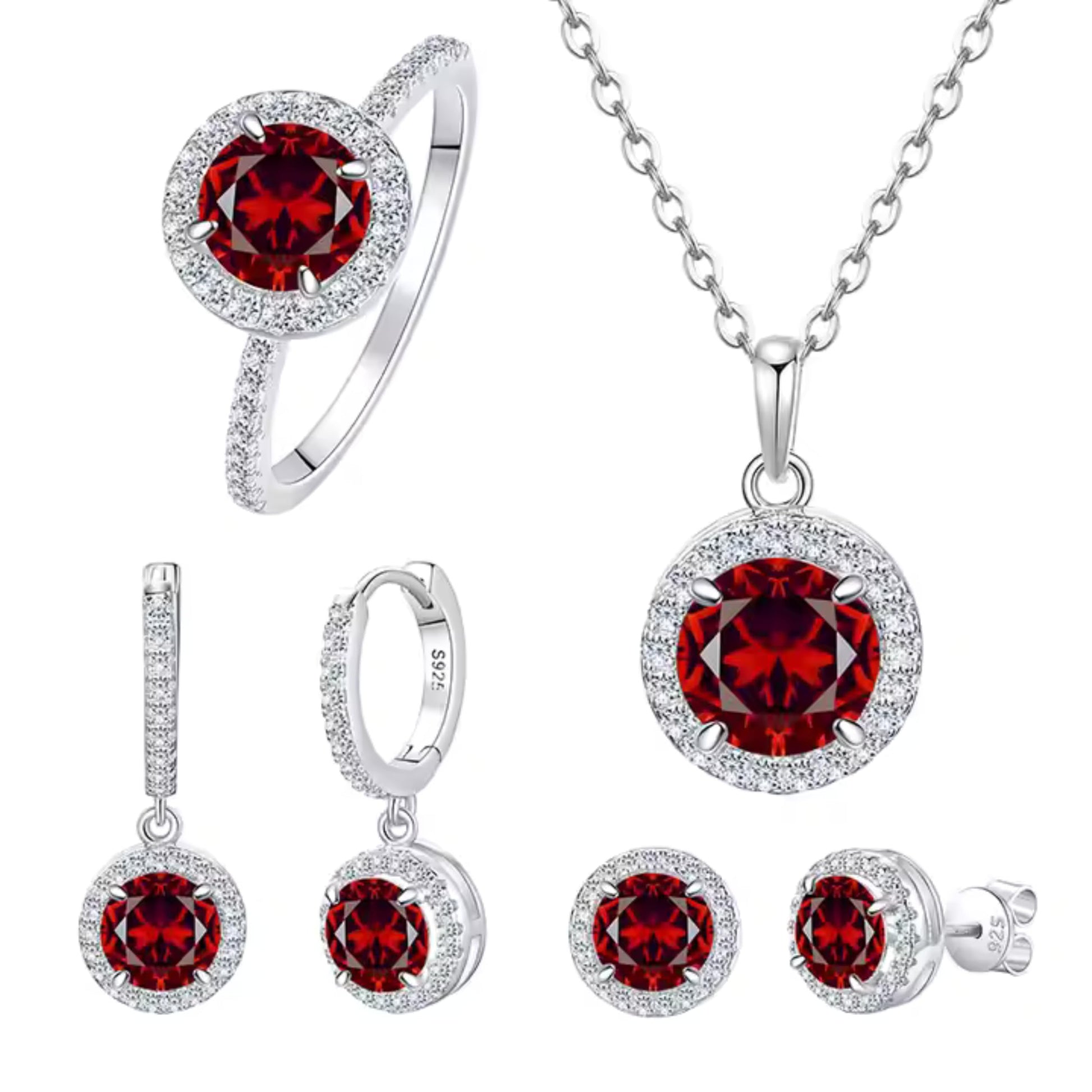 925 Sterling Silver Round Birthstone Red Stone Zircon Diamond Jewelry Set for Women, Halo Necklace, Earrings & Ring, 4 Pieces