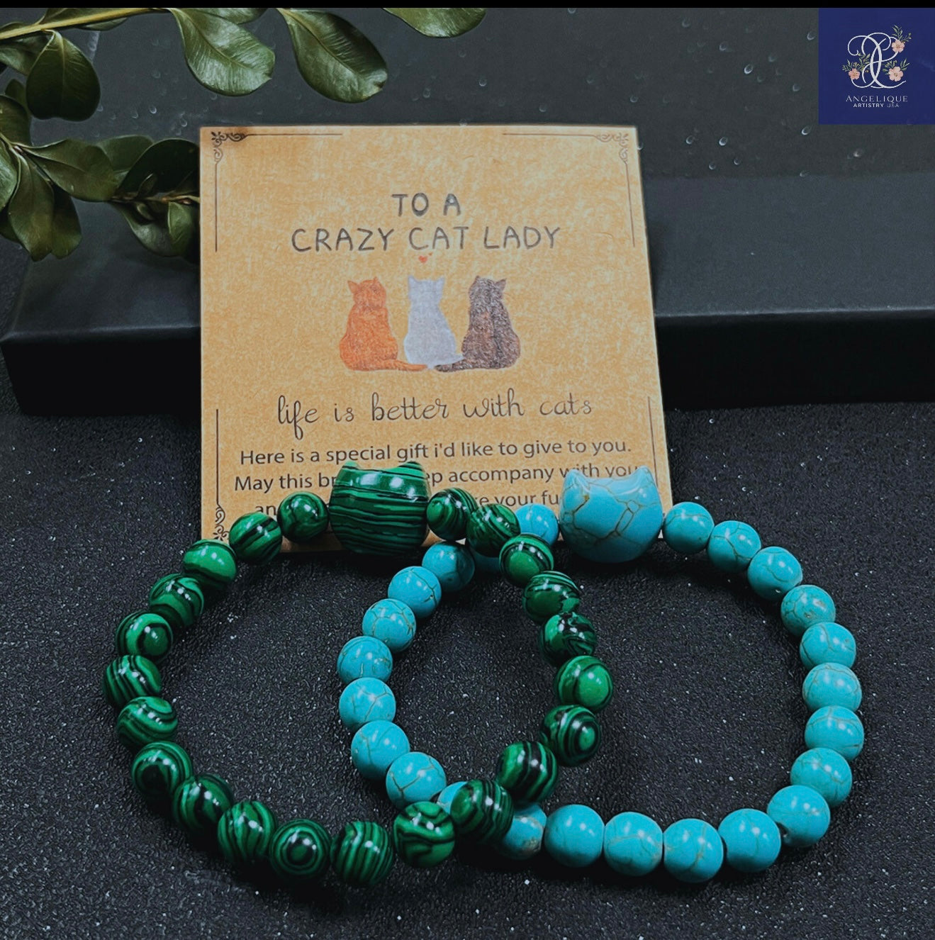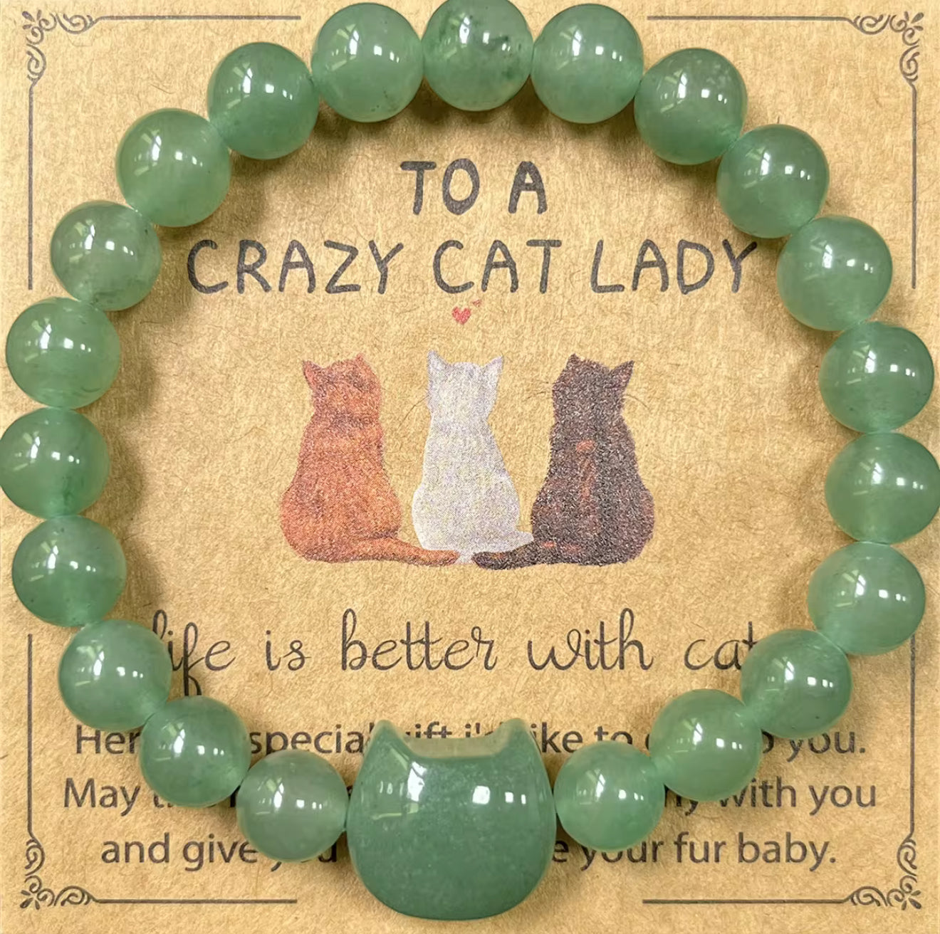 Show off your love for felines with this unique and stylish bracelet set, perfect for cat lovers! Each bracelet features a cat-shaped bead made from natural stones such as turquoise, malachite, yellow tiger, and green aventurine. The set comes with a special card that reads, "Crazy to a cat lady," making it a thoughtful gift for any cat enthusiast.