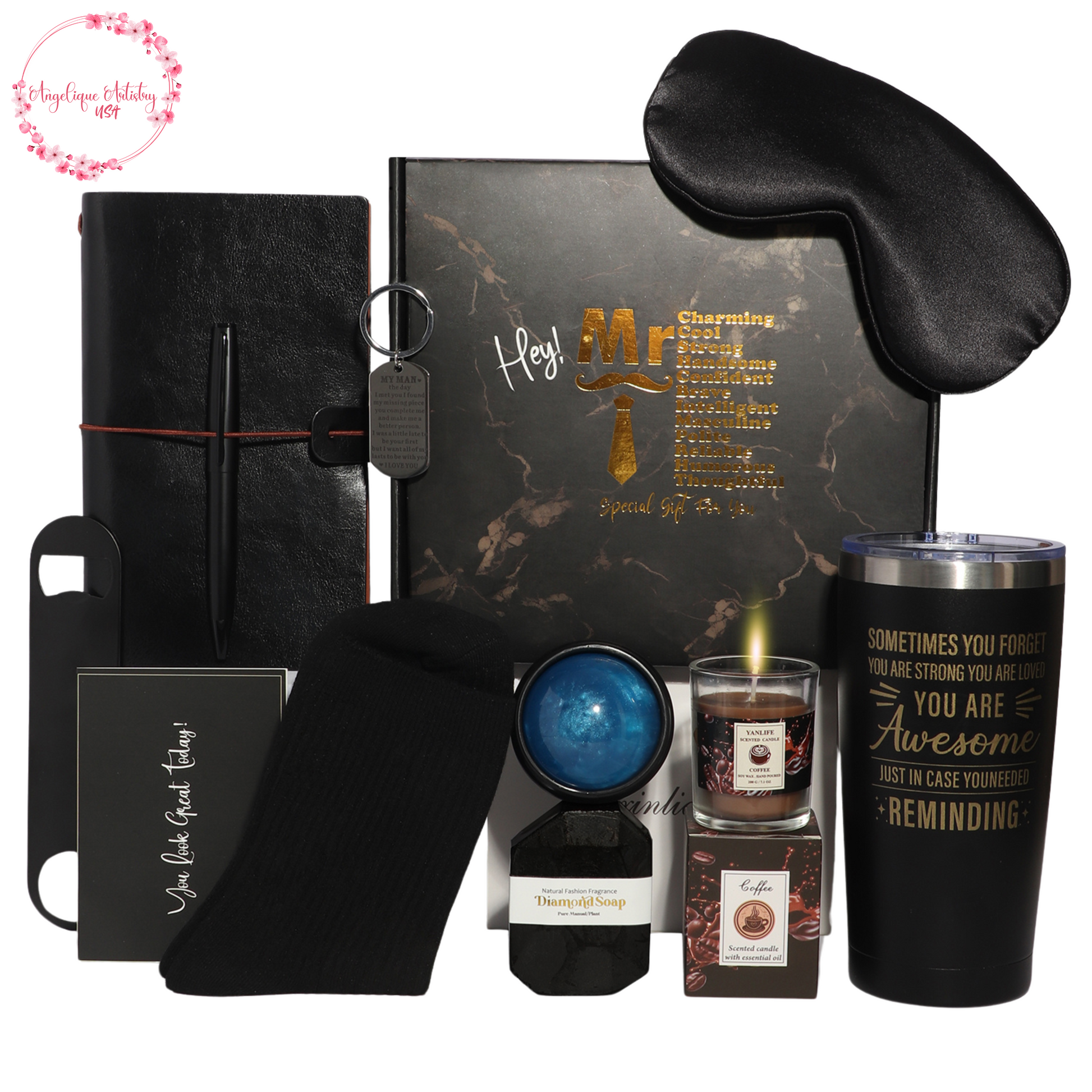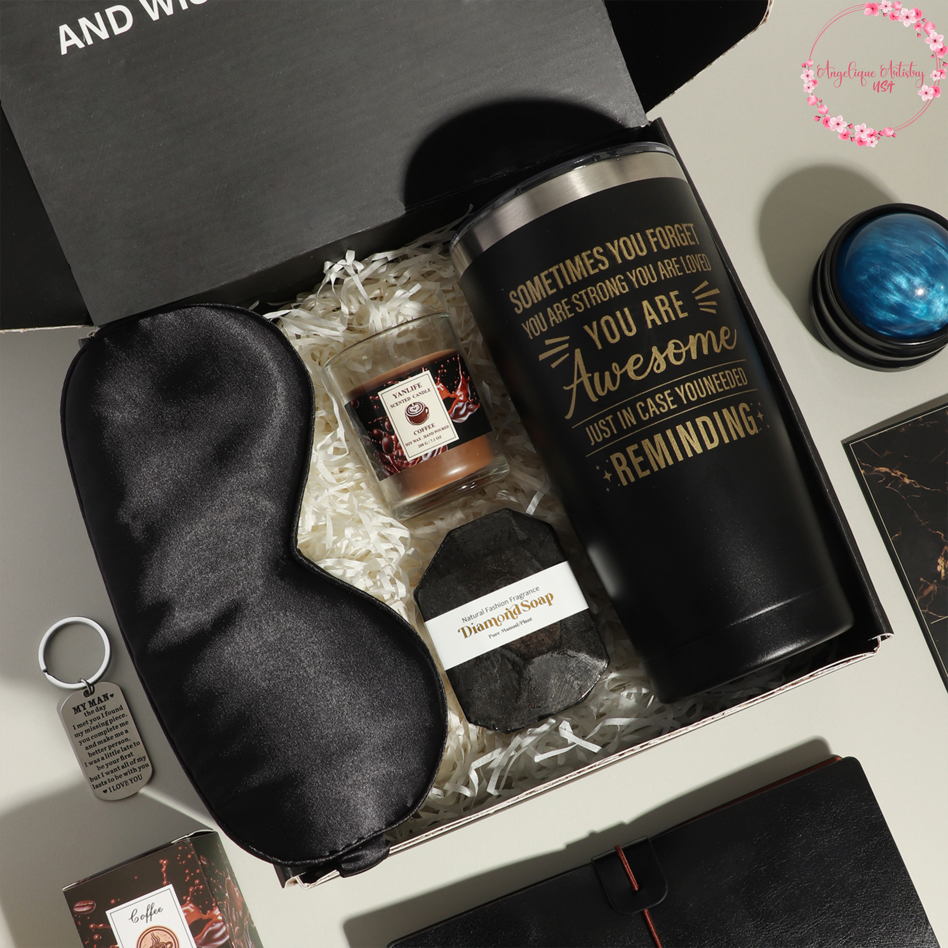 QUALITY COMPONENTS: Features a stainless steel tumbler, leather-bound journal with pen, aromatic candle, diamond soap, and silky eye mask for comfort.